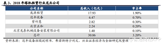 虽然塔式起重机服务市场经过一轮产能出清后参与者数量大幅下降,但行业内企业仍以中、小型塔式起重机服务商为主,市场集中度偏低。据弗若斯特沙利文数据,2018年国内塔式起重机服务行业市场份额前五的公司为庞源租赁(1.90%)、达丰设备(0.70%)、紫竹慧(0.30%)、北京正和(0.20%)、北京龙泰机械设备安装有限公司(0.10%)。