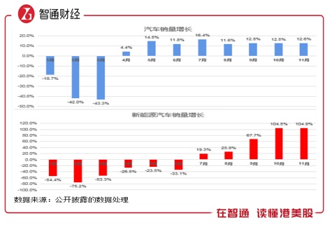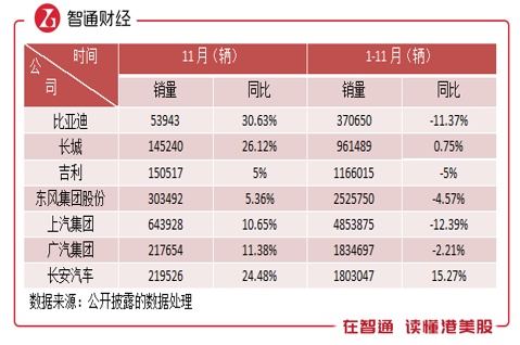 智通财经APP了解到,各大车企均已公布了11月及前11个月的销量,11月份均保持了按月同比增长,其中比亚迪、长城(02333)、上汽、广汽(02238)及长安实现双位数增长,比亚迪以30.63%的增长水平领跑行业。前11个月,整体汽车板块受疫情影响销量下降,不过长安汽车表现亮眼,实现销量增长15.27%,主要为销量常年下滑导致基数较低。