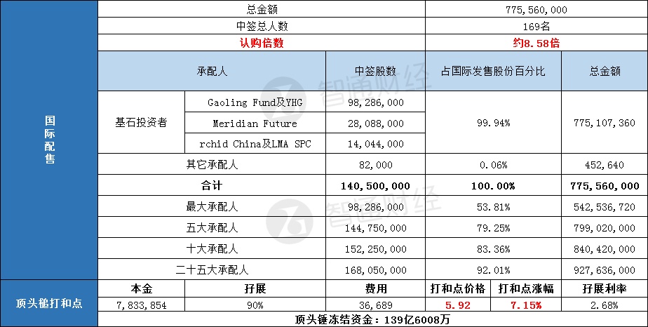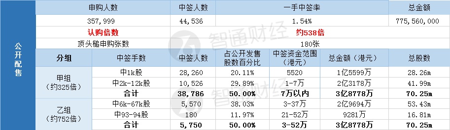 其中,公开配售申购人数357999人,一手中签率1.54%,认购倍数约538倍。