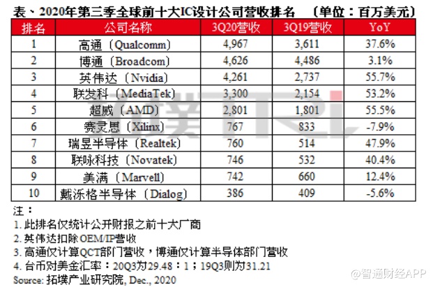 智通财经APP获悉,根据TrendForce集邦咨询旗下拓墣产业研究院最新统计,2020年第三季全球前十大IC设计业者营收排名出炉。