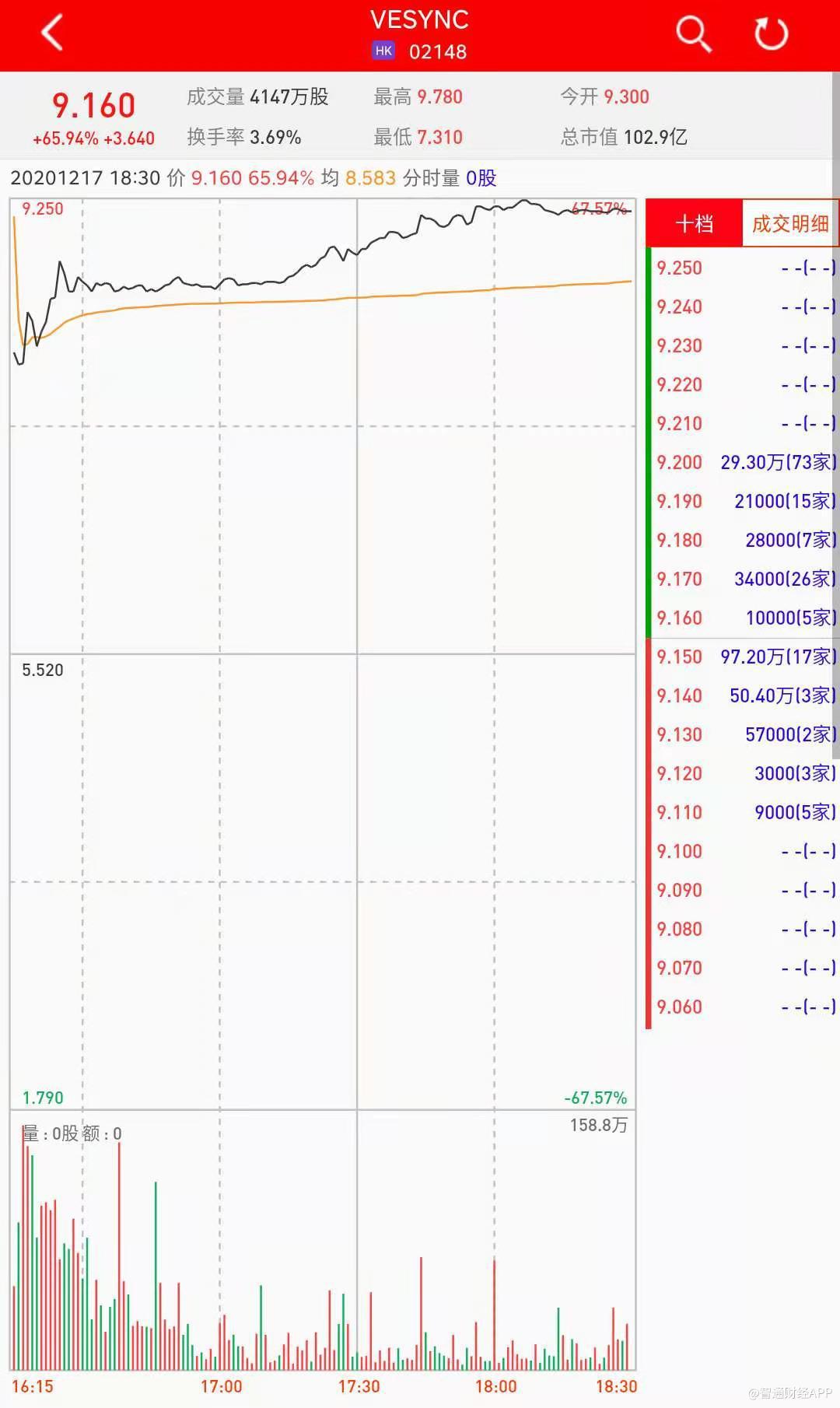智通财经APP获悉,VESYNC(02148)将于12月18日(周五)在香港挂牌,截至暗盘收盘,利弗莫尔证券资料显示其暗盘报价9.16港元,较招股价5.52港元涨65.94%。每手1000股,不计手续费,每手赚3640港元。