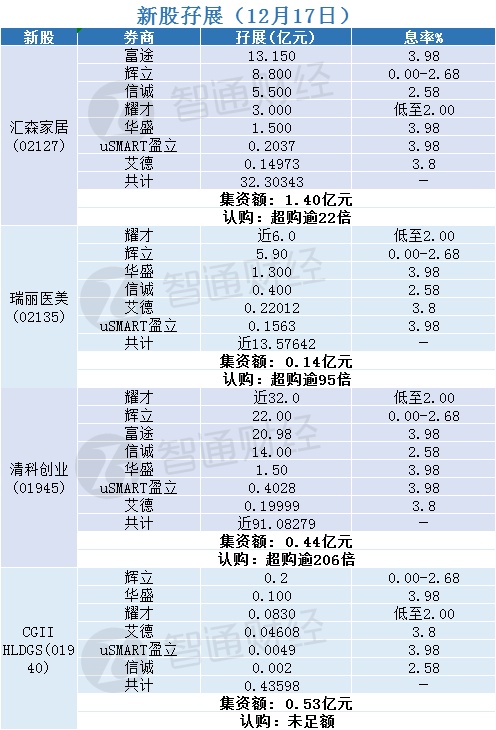 智通财经APP获悉,汇森家居(02127)、瑞丽医美(02135)、清科创业(01945)、CGII HLDGS(01940)正在招股中。截至12月16日,辉立、耀才、信诚等合计分别为其借出32.30343亿港元、近13.57642亿港元、近91.08279港元及0.43598亿港元。其中汇森家居超购逾22倍、瑞丽医美超购逾95倍、清科创业超购逾206倍,CGII HLDGS未足额。