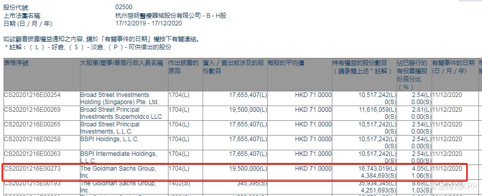 智通财经APP获悉,香港联交所最新资料显示,12月11日,高盛减持启明医疗-B(02500)1950万股,每股作价71港元,总金额约为13.85亿港元。减持后最新持股数目约为1674.3万股,最新持股比例为4.05%。