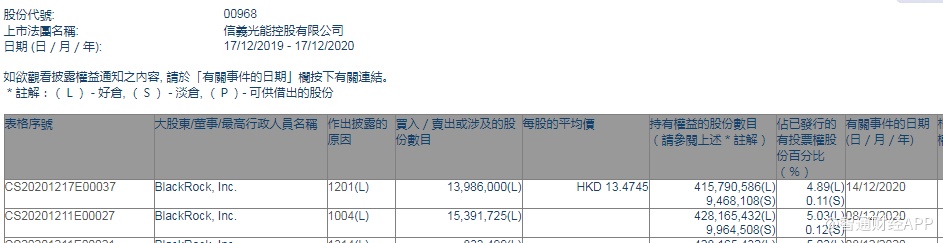 智通财经APP获悉,香港联交所最新资料显示,12月14日,贝莱德减持信义光能(00968)1398.6万股,每股作价13.4745港元,总金额约为1.88亿港元。减持后最新持股数目为4.16亿股,最新持股比例为4.89%。
