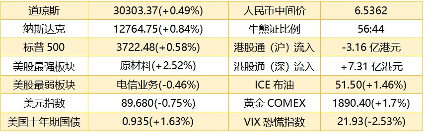 1、 隔夜美股截至收盘,道琼斯指数涨148.83点,涨幅0.49%,报30303.37点;标普500指数涨21.31点,涨幅0.58%,报3722.48点;纳斯达克综合指数涨106.56点,涨幅0.84%,报12764.75点。港股ADR指数则出现小幅下跌,按比例计算,收报26607点,跌70.54点或0.27%。
