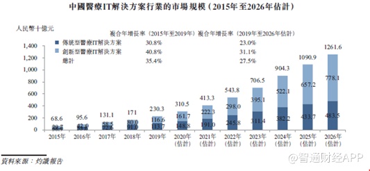 根据灼识咨询统计,按收入计,中国医疗IT解决方案行业规模从2015年的686亿元增至2019年的2303亿元,复合年增长率达到35.4%,预计2026年将进一步增至1.26万亿元,复合年增长率达到27.5%,达到万亿级别的市场规模。