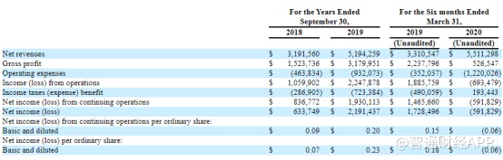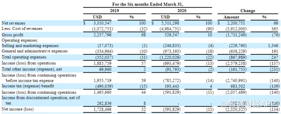 对比2019上半财年与2020上半财年的数据不难看出,2019财年上半年,公司整体毛利率高达68%,但在2020财年上半年,这一数据锐减为10%,这也意味着公司当期收入成本增长了约3.6倍。