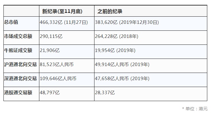截至2020年11月底,香港市场已突破多个纪录,包括: