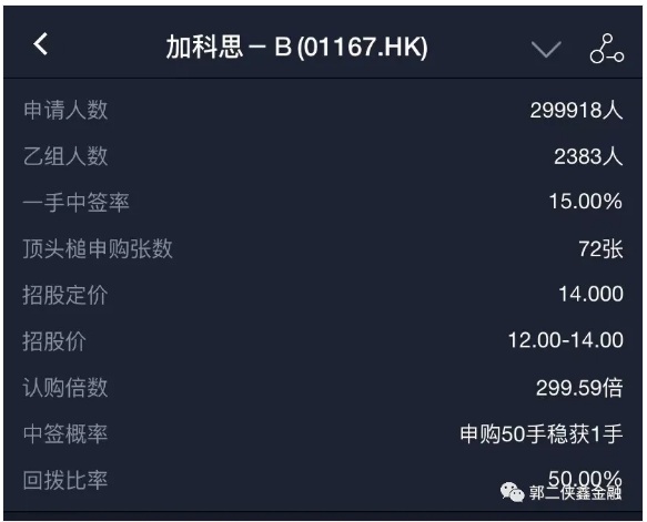 申购人数299918人,最终超额认购299.59倍,回拨至50%,顶头槌72张,一手中签率15%,申购50手稳中一手。本次招股价区间为12.0~14.0港元,最终以上限定价14.0港元,每手4200港元。