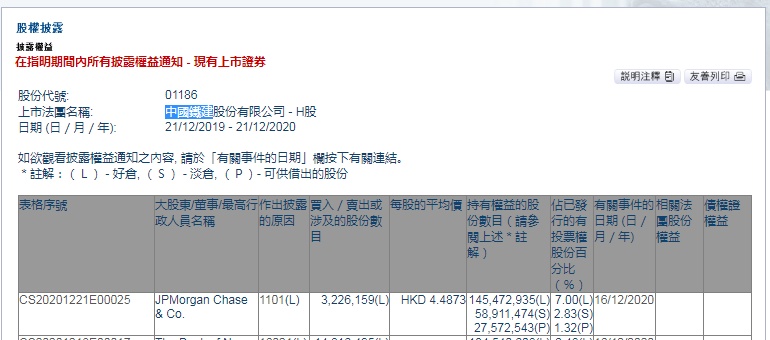智通财经APP获悉,香港联交所最新资料显示,12月16日,摩根大通增持中国铁建(01186)322.6159万股,每股作价4.4873港元,总金额约为1447.6743万港元,增持后最新持股数目约为1.45亿股,最新持股比例为7%。