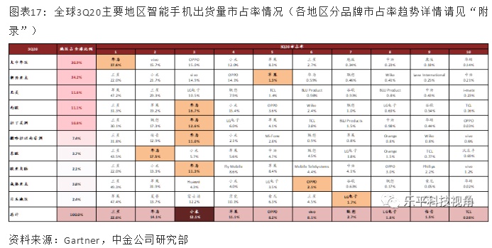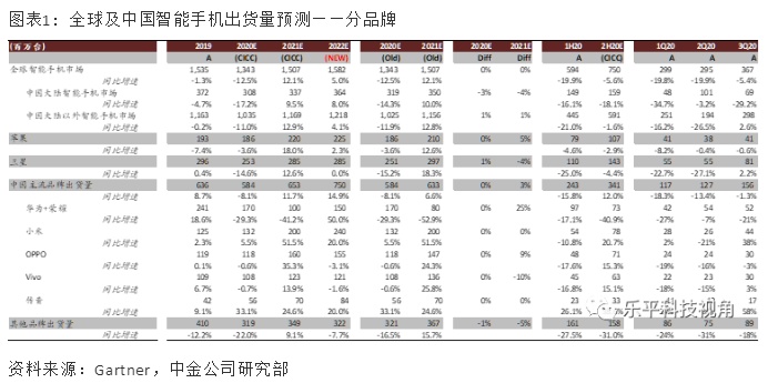品牌:出货量增速苹果>安卓,小米全球第三,荣耀回归时间表示最大确定因素。受芯片缺货影响及苹果强周期等因素影响,总体我们预计安卓手机出货量增速弱于苹果。我们上调苹果2021年出货量5%至2.20亿部,同比增长18%。安卓方面,我们看好小米在海外及国内中高端市场份额提升,维持全球2亿台出货量及份额世界第三的预测。我们预计新荣耀有望在2H21重回市场,全年华为+荣耀总货1亿部,同比下滑41.2%,但实际回归时间表及能够销售的市场和产品受美国监管审核影响,存在较大不确定性。