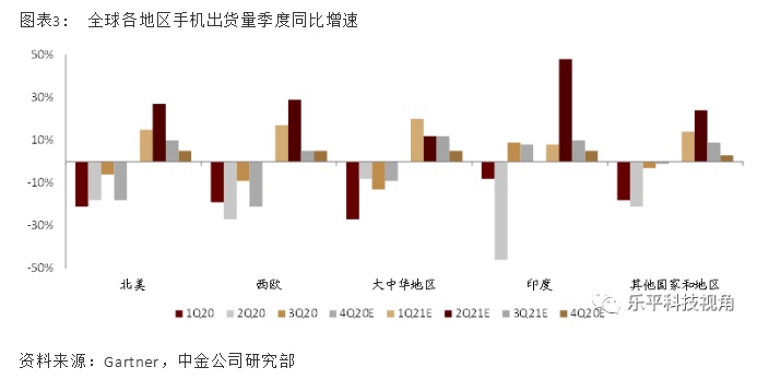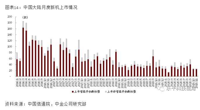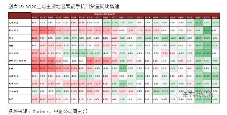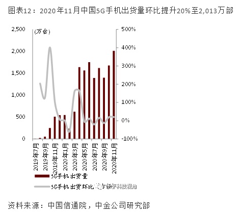 出货量:2021年手机销量有望实现12.1%增长,但低于2019年水平。根据信通院数据,11月大陆智能手机出货量同比下降17%,1-11月出货量2.7亿台,同比下跌21%。但11月和1-11月5G手机渗透率分别达到72.6%/53%,高于年初预期。根据Gartner数据,全球3Q20智能机出货量同比下降5%,印度、印尼等新兴国家反弹明显。展望2021年,我们预计全球手机有望同比增长12.1%至15.07亿部,仍不及卫生事件前水平,其中中国市场增长9.5%到3.37亿台,低于全球平均,反映5G应用仍处于培育期。分季度来看,我们预计全球1Q21出货量同比转正。地区来看,我们预计明年印度将成为复苏最快的地区。