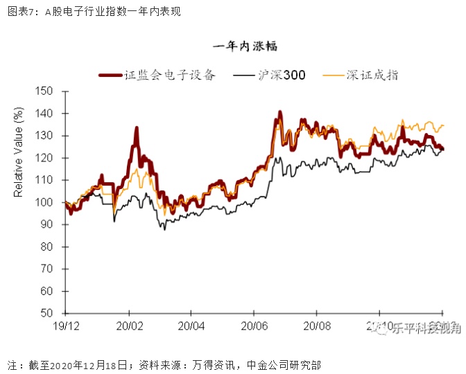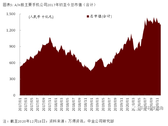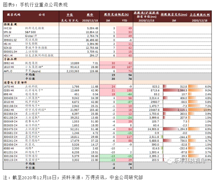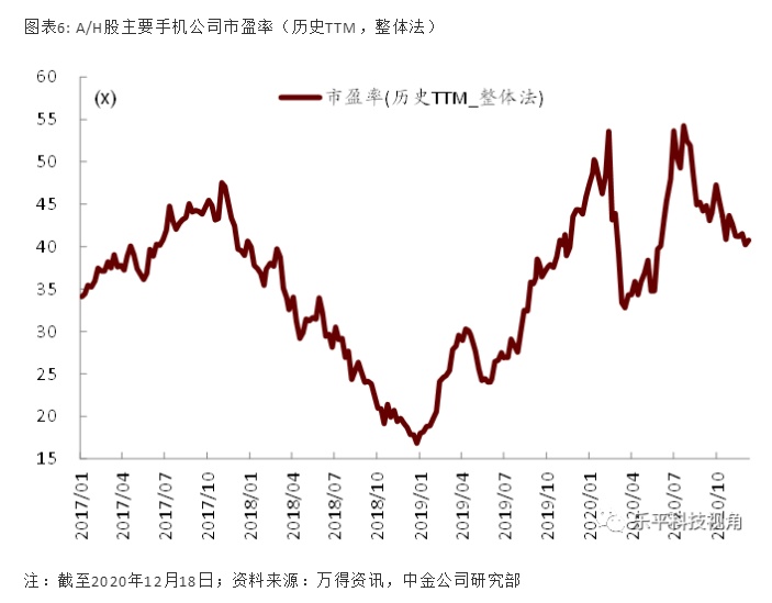 受对AirPods增速放缓的担忧以及行业板块轮动影响,过去一个月(11/13-12/18),A/H消费电子板块总市值下降5.1%,A/H手机产业链TTM P/E 40.8倍,处于2017年以来70%,2021年PE估值25.7倍。近期,手机行业发生iPhone 12加单,安卓芯片缺货等重要事件,反映苹果(AAPL.US)新机发布及华为事件的影响,我们调整全球手机行业2021年份额,新发布2022年手机行业预测。我们预计2021年手机行业增长12.1%,但低于2019年水平。展望2021年,我们认为手机出货量强劲回升,以及小米(01810)出货量跃居全球第三是两个确定性很高的趋势。荣耀是否能在下半年如期回到市场是最大的变数。此外,我们预计TWS耳机市场规模到2021年会超过手机的10%,仍然保持65%的高速增长,成为推动元器件厂商业绩增长的主要动能之一。此外,AR/VR及扫地机器人等新品类上的创新,以及汽车电子化这个长赛道也值得持续关注。