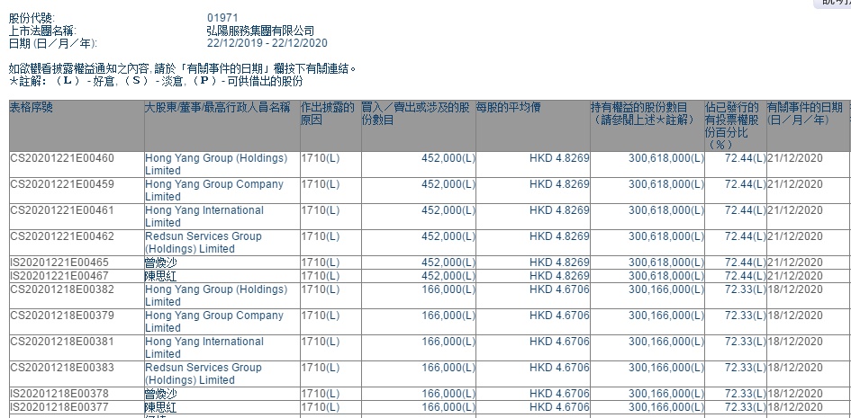 智通财经APP获悉,弘阳服务(01971)再获大股东增持,据港交所最新权益披露资料显示,弘阳服务于12月21日获大股东再增持45.2万股,合计2,181,740港元。两日来,大股东已累计增持弘阳服务61.8万股,共耗资约2,957,060港元。