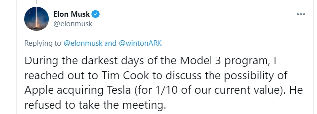 马斯克在社交媒体上表示,“在特斯拉Model 3项目最黑暗的日子里,我曾接触苹果公司CEO库克,希望能与其讨论让苹果(以现在市值的十分之一的价格)收购特斯拉的可能性。但库克拒绝参加会面。”