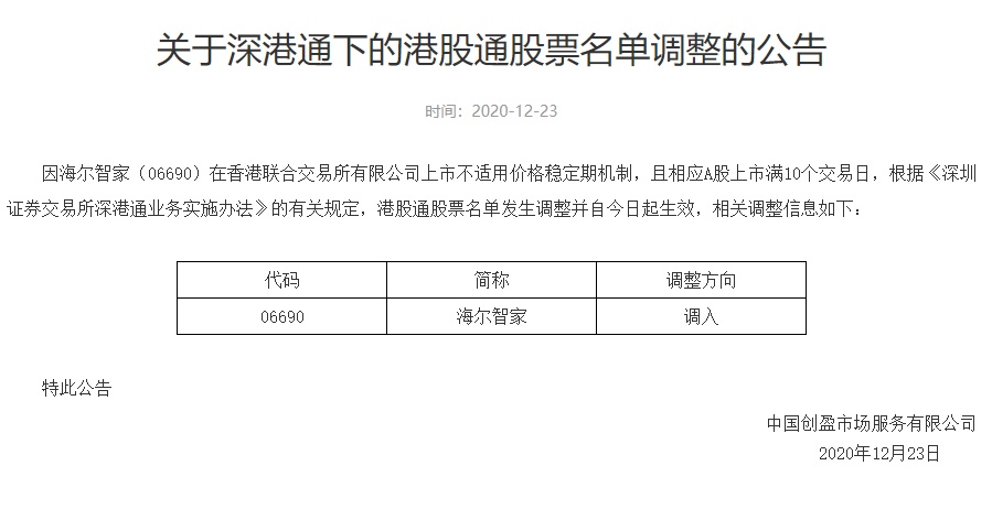 智通财经APP获悉,据深交所官网今日(12月23日)披露,因海尔智家(06690)在香港联合交易所有限公司上市不适用价格稳定期机制,且相应A股上市满10个交易日,根据《深圳证券交易所深港通业务实施办法》的有关规定,将海尔智家调入港股通股票名单,今日起生效。
