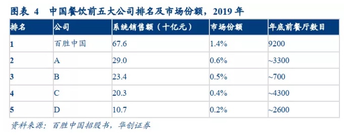 根据公司招股书披露的弗若斯特沙利文统计数据,2019年百胜中国的系统销售额为676亿元,市场份额1.4%,为中国最大的、也是极为分散的餐饮市场中唯一销售额占比超过1pct的餐饮集团,规模领先且拥有较高知名度,无论是销售额、市场份额或是门店数量指标,百胜中国都远超排名第二的麦当劳(MCD.US)。
