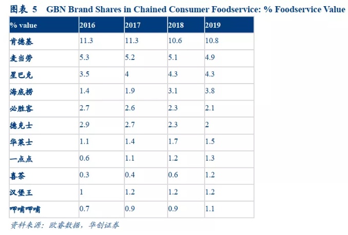 根据欧睿统计的GBN(Global Brand Name)榜单,2016年-2019年以连锁餐厅的终端销售额统计,肯德基市场份额为第一,占比超过十个点,远高于排名第二的麦当劳。
