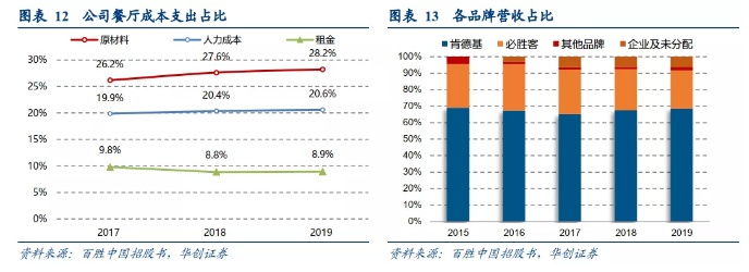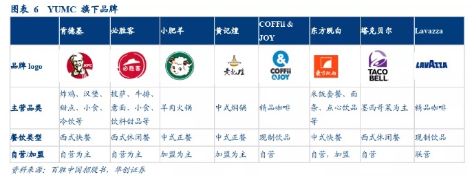 公司目前完整覆盖中式餐饮、西式餐饮、休闲餐饮和现制饮品品类,其中西式快餐有肯德基,中餐有小肥羊、东方既白、黄记煌,西式休闲餐饮包括必胜客、塔克贝尔,现制饮品品类包括COFFii&JOY、Lavazza。公司拥有肯德基、必胜客和塔可贝尔三个品牌的独家运营和授权经营权,作为交换向YUM支付来自自营餐厅及加盟餐厅销售额的3%作为特许经营费,并完全拥有东方既白、小肥羊、黄记煌和COFFii & JOY连锁餐厅品牌。