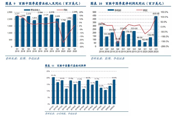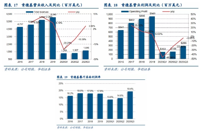 2019年,百胜中国旗下肯德基实现营收60.40亿美元,同增6.19%,实现营业利润9.49亿美元,同增6%。2020年Q3肯德基营收为16.46亿美元,同增3%,营业利润为2.86亿美元,同比减少3.05%。餐厅层面利润率为19.4%(去年同期为20.1%),大体保持平稳。