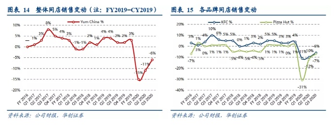 同店销售增长方面,2020年受卫生事件影响,各品牌SSSG均有不同程度下降,同店销售增长下降主要因同店交易数目下降。截至2020年Q3单季度,肯德基同店销售为-6%,必胜客与公司整体则分别为-7%和-6%。