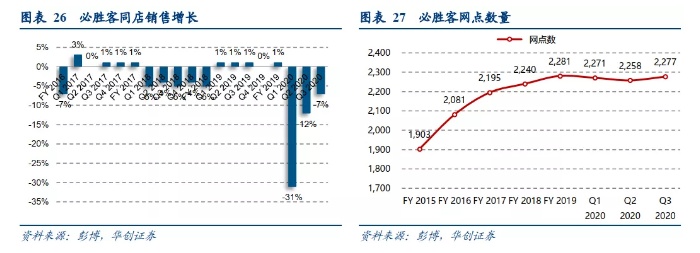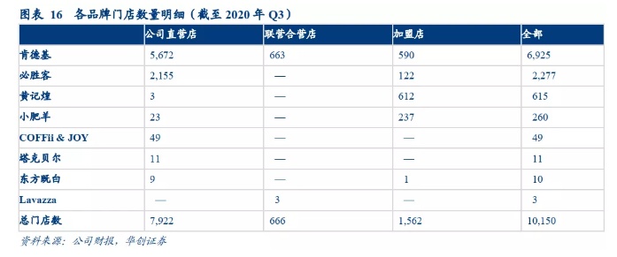 截至2020年Q3,公司共有10150家门店,当中自营餐厅7922家(肯德基5672家,必胜客2155家),联营合营公司666家,其中663家为肯德基餐厅;加盟店1562家,其中肯德基590家,必胜客122家,黄记煌612家,小肥羊237家,另有3家Lavazza旗舰店。所有门店中,肯德基餐厅共6925家, 在门店数量中占比68%,必胜客门店2277家,占比22%;门店数量与营收贡献基本保持一致。