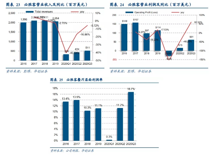 2019年,百胜中国旗下必胜客实现营收20.54亿美元,同减2.70%,实现营业利润1.14亿美元,同增17.53%。2020年Q3必胜客实现营收5.11亿美元,同比降低5.72%,实现营业利润0.61亿美元,同比增长60.53%。餐厅层面利润率为16.7%。2019年后同店销售增长由负转正(主要由门店流量增长贡献,得益于必胜客振兴计划,翻新门店装修,推广数字化,加强营销,提升外卖占比等),当前同店销售恢复至93%左右。
