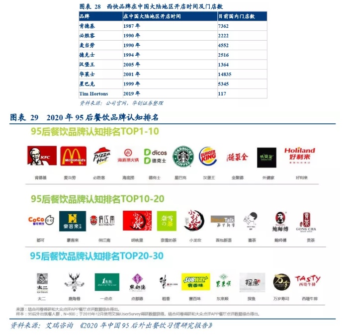 相较于其他西式快餐公司,西式休闲餐饮公司等,肯德基进入中国市场时间最早,大众知名度较高。从艾瑞咨询统计的95后餐饮品牌认知度来看,肯德基认知程度最高。