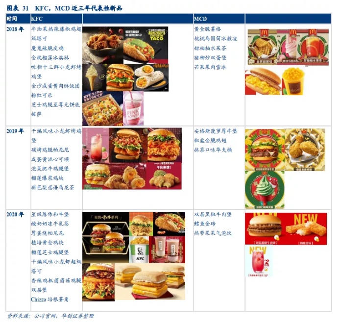 肯德基是国内第一个提供中式早餐(如粥及油条)的西式快餐品牌,也是消费者感知中菜单本地化程度最强的西快。2019年,公司开发了超过1900道新菜品,推出了大约400款新产品。公司依托供应链进行西快菜单本土化改造能力较强。先是早饭开卖粥、油条、豆浆,之后加入老北京鸡肉卷、盖浇饭等中式菜品。多款创新菜品融合了西式快餐和中式口味,引发社交媒体热议,如榴莲爆浆鸡块、榴莲爆浆酿翅、小龙虾口味烤鸡堡等。