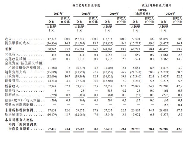 招股书显示,截至2017年、2018年及2019年12月31日止三个年度以及2020年前6个月,公司收益分别约为1.18亿元、1.59亿元、1.78亿元以及5889.7万元。