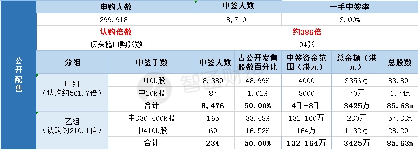 其中,公开配售申购人数299918人,一手中签率3%,认购倍数约386倍。