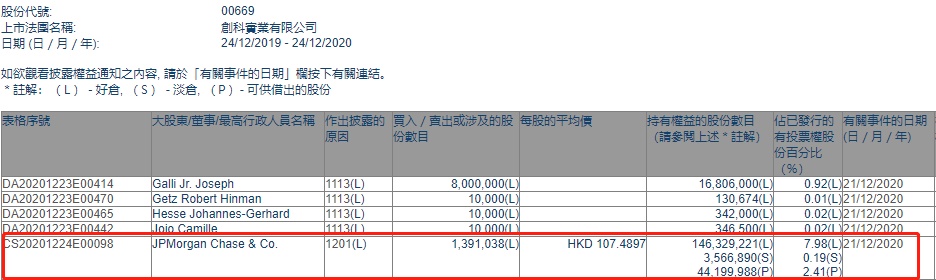 智通财经APP获悉,香港联交所最新资料显示,12月21日,摩根大通减持创科实业(00669)139.1038万股,每股作价107.4897港元,总金额约为1.50亿港元。减持后最新持股数目约为1.46亿股,最新持股比例为7.98%。
