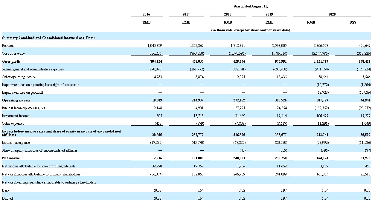 2020财年公司营收为33.67亿元;毛利润为12.22亿元,同比上升25.04%;净利润1.64亿元,同比下降35.04%;归属于普通股股东净利润为1.61亿元,同比下降33.2%;基本和摊薄后每股收益1.34元,上年同期为1.97元。