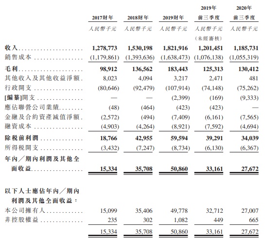 企业总收入从2017财年的约人民币12.79亿元增加约人民币5.43亿元至2019财年的约人民币18.22亿元,复合年增长率为19.4%。2020年前三季度总收入约人民币11.86亿元,去年同期约人民币12.01亿元,同比下降约1.31%。该企业年内利润及其他全面收益从2017财年的约人民币1533.4万元增加约人民币3552.6万元至2019财年的约人民币5086万元,复合年增长率约为82.4%。2020年前三季度年内利润及其他全面收益约人民币2767.2万元,去年同期约人民币3316.1万元,同比下降约16.55%。