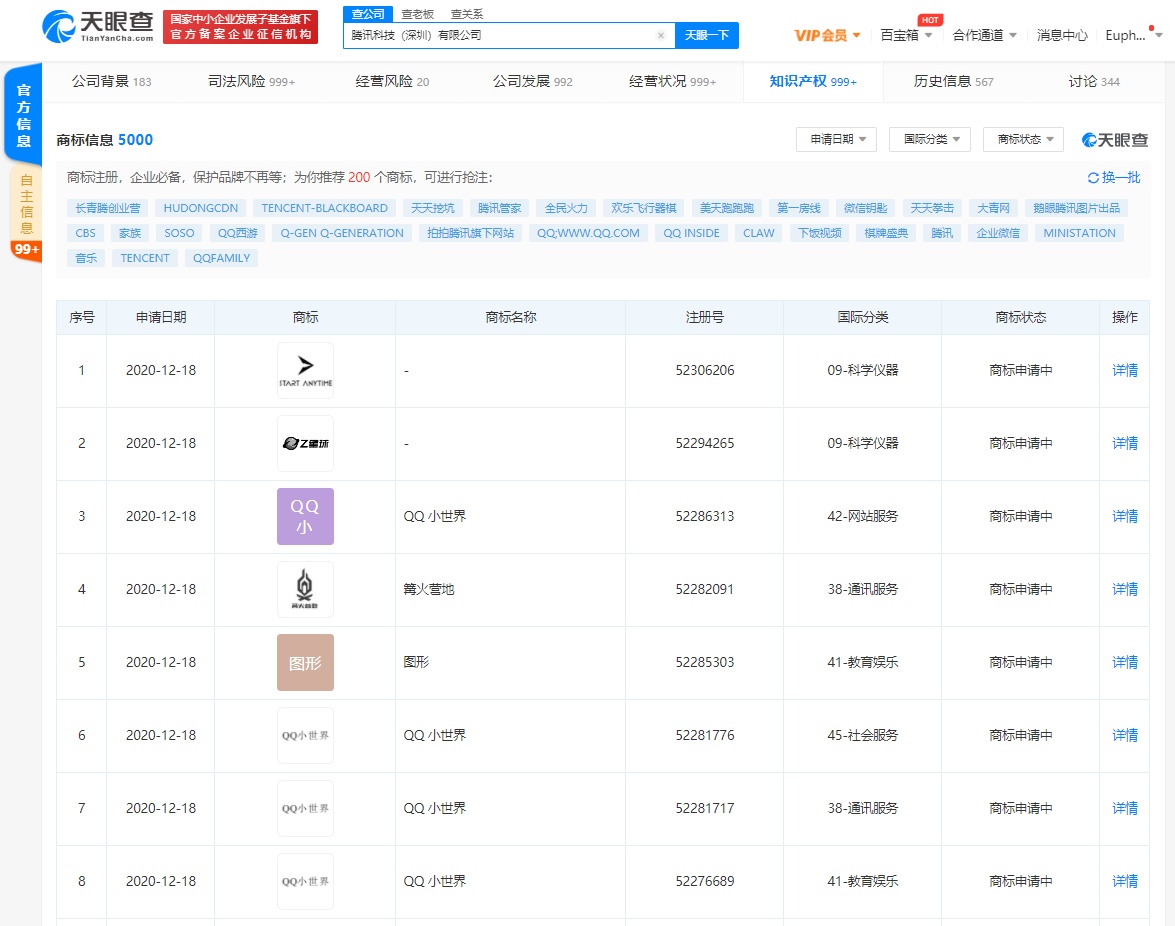 智通财经APP获悉,12月25日消息,天眼查App显示,腾讯科技(深圳)有限公司于2020年12月18日申请商标“QQ小世界”,商标涉及的国际分类包括通讯服务、教育娱乐等,目前商标状态为“商标申请中”。
