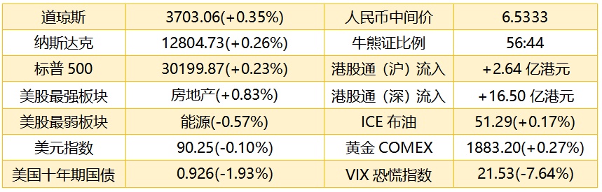 1、 截至上周四收盘,标普500指数涨13.05点,涨幅0.35%,报3703.06点;纳斯达克指数涨33.62点,涨幅0.26%,报12804.73点;道琼斯指数涨70.04点,涨幅0.23%,报30199.87点。港股ADR指数下挫,按比例计算,收报26129点,跌256.58点或0.98%。