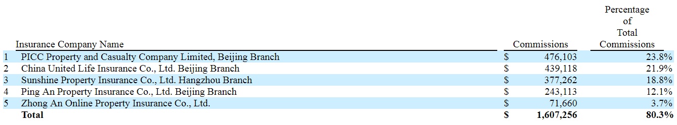 虽然天睿祥与超40家保险公司达成合作,但其佣金收入的大部分则来源于头部保险公司。2019财年时,来自中国人民财产保险股份有限公司北京分公司的佣金收入占比为23.8%;来自中国联合人寿保险北京分公司的佣金收入占比为21.9%;来自阳光财产保险杭州分公司的占比为18.8%;来自平安财产保险北京分公司的占比为12.1%,来自众安在线的占比为3.7%。前五大合作保险机构合计占比高达80.3%,这也符合保险行业的头部品牌效应。