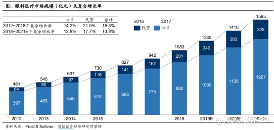 根据Frost&Sullivan测算,2012~2018年,眼科医疗市场从461亿元增长至1083亿元,年复合增长率达15.3%。2012~2018年,民营眼科年复合增长率达21%,市场占比从13.88%增长至18.56%,民营医院增速高于公立医院。随着患者基数增长、医疗支出增加、技术进步以及政策扶持,预计未来眼科医疗市场仍将保持高速增长,扩张速度快、经营效率高的民营眼科将乘势而上,规模不断扩大。