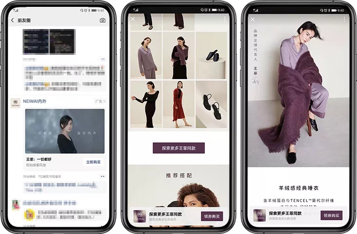 国货内衣品牌“NEIWAI内外”正是在微盟全方位加持下,借助朋友圈广告引流到小程序商城实现公私域互通。无论是代言明星王菲的粉丝,还是内外品牌的忠实及潜在用户,都可以轻松通过朋友圈广告,快速跳转进入内外官方小程序商城下单购物,实现品牌曝光和销售转化的双重增长。