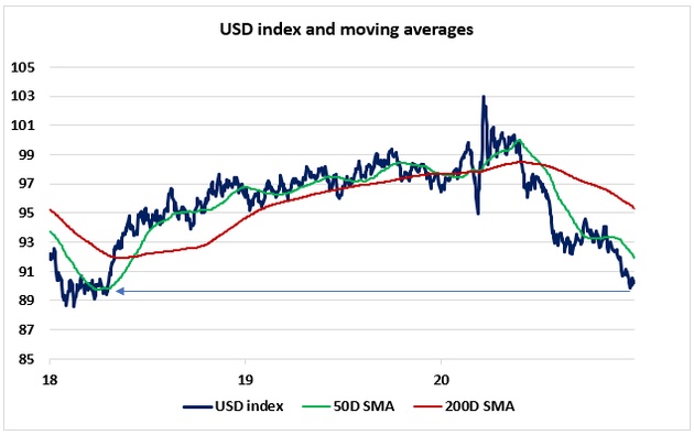 今年迄今,美元跌幅达6.5%,目前处于2018年4月以来的最低水平。尽管投资者对2021年美元指数的走势持非常消极的态度,一些看空的投资者甚至认为我们才刚刚进入熊市,未来三年的下跌空间在20%-30%,全球宏观货币研究所Rothko Research却持不同的观点。该机构认为,美国以外的其他央行不会让这个趋势延续下去,因为这会影响他们国家经济的复苏,同时打压长期通胀预期。