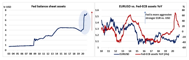 自3月以来,美元的主要催化剂是美联储和其他央行资产负债表上的资产差异。与其他主要央行相比,美联储的干预力度要大得多,其资产规模几乎翻了一番,从2月份的4万亿美元增至今天的7.4万亿美元(下图的左图)。下图的右图显示了过去一个周期内美联储和欧洲央行资产增长差异和欧元兑美元汇率之间的协同运动。虽然央行不应该以汇率为目标,但他们可以通过使用大规模资产购买计划来影响汇率。