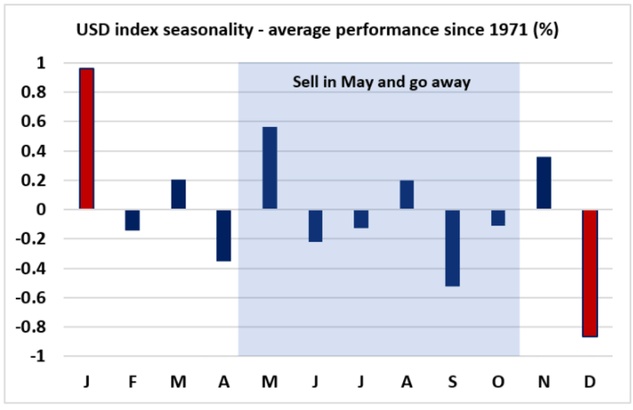 下图显示了美元指数在过去五十年的周期表现。对美元指数来说,12月通常是熊市,平均回报为-85个基点,但从历史上来看,1月是表现最好的月份,自1971年1月以来,美元指数平均回报接近1%。