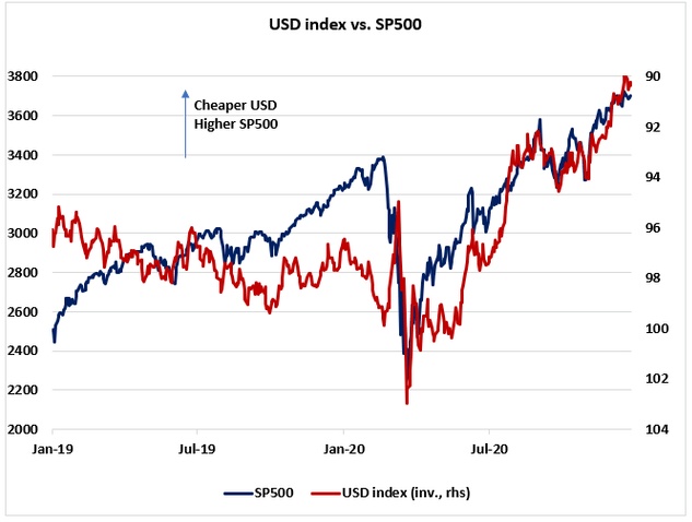 然而,美联储和欧洲央行的资产增长差异在最近几个月里持续下降,因为美联储没有采取什么行动,而欧洲央行正通过紧急抗卫生事件购债计划(PEPP)注入流动性。即使美联储仍有望在2021年向市场额外注入1万亿美元的流动性(每季度2400亿美元),Rothko Research认为,美联储在未来12个月的扩表计划已经被市场Price in了,因此对美元的影响将较小。