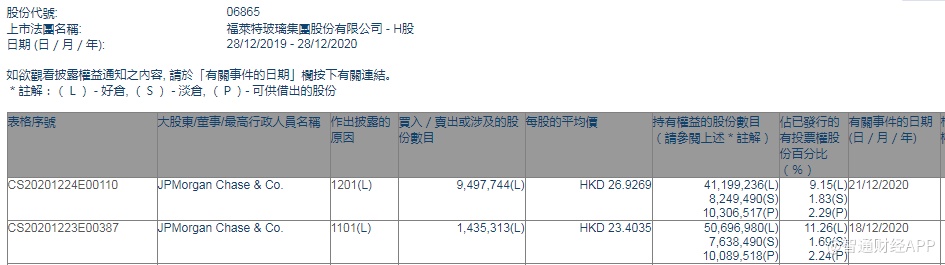智通财经APP获悉,香港联交所最新资料显示,12月21日,摩根大通减持福莱特玻璃(06865)约949.77万股,每股作价26.9269港元,总金额约为2.56亿港元。减持后最新持股数目约为4119.92万股,最新持股比例为9.15%。