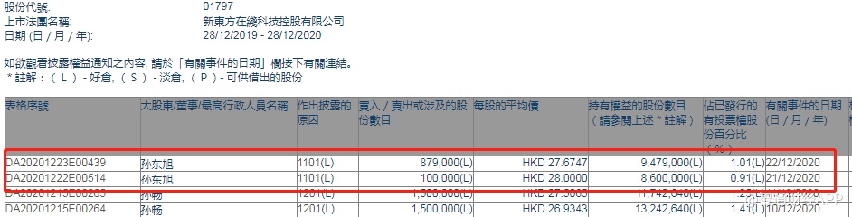 智通财经APP获悉,香港联交所最新资料显示,12月21-22日,行政总裁兼执行董事孙东旭两日分别增持新东方在线(01797)10万股、87.9万股,每股作价分别为28港元、27.6747港元,总金额约为2712.61万港元。增持后最新持股数目为947.9万股,最新持股比例为1.01%。