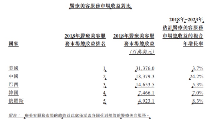 具体而言,据弗若斯特沙利文报告显示,按收入计,2018年中国已成为第二大医疗美容服务市场,收入达到183.793亿美元,占全球医疗美容服务市场约13.5%的市场份额,并成为全球前十大市场中增速最快的市场。另据艾瑞的报告显示,中国医美市场有望在2021年超越美国,成为医美第一大市场,2023年市场规模将达到人民币3115亿元。由此可见,医美行业的市场容量还是很大的,不到几年的功夫就已经达到了千亿级别规模。