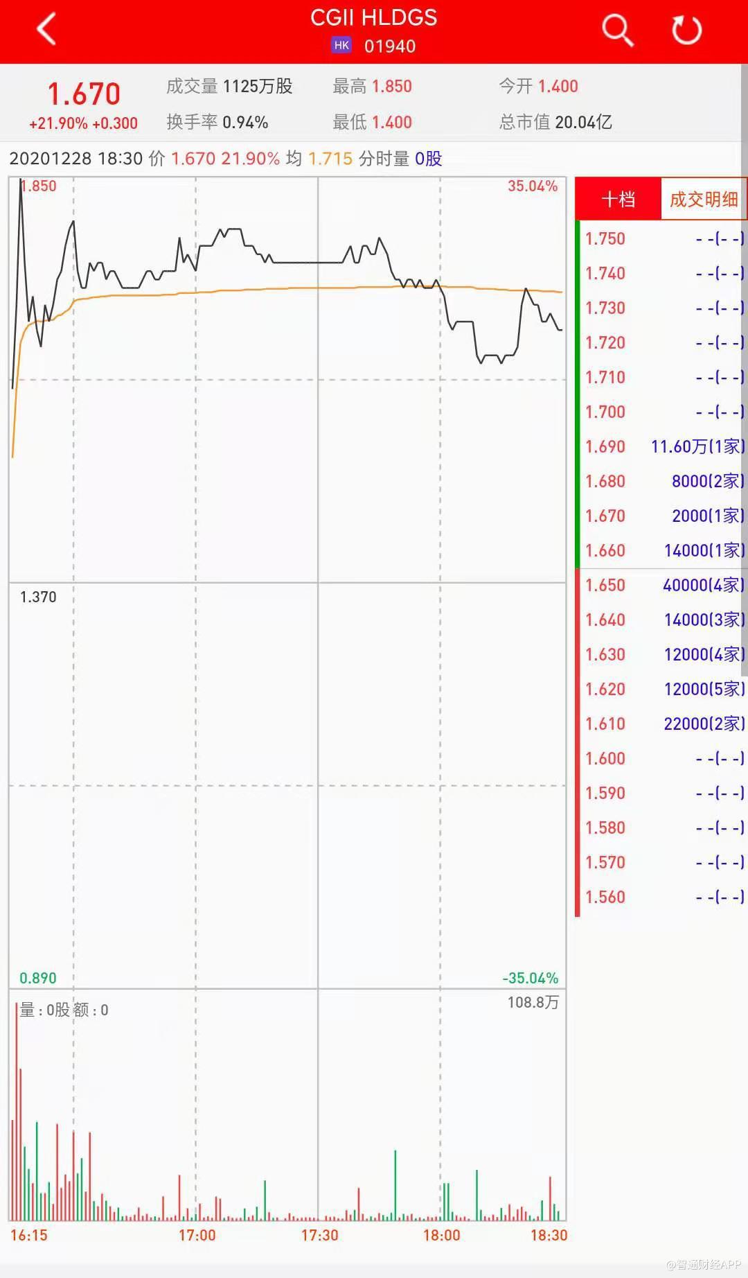 智通财经APP获悉,CGII HLDGS(01940)将于12月29日(周二)在香港挂牌,截至暗盘收盘,利弗莫尔证券资料显示其暗盘报价1.67港元,较招股价1.37港元涨21.9%。每手2000股,不计手续费,每手赚600港元。
