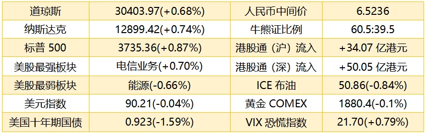 1、 隔夜美股截至收盘,三大指数均创历史新高,道指初段涨超过300点。截至收盘,道琼斯指数涨204.10点,涨幅0.68%,报30403.97点;标普500指数涨32.30点,涨幅0.87%,报3735.36点;纳斯达克综合指数涨94.69点,涨幅0.74%,报12899.42点。港股ADR指数跟随上涨,按比例计算,收报26433点,涨119.38点或0.45%。