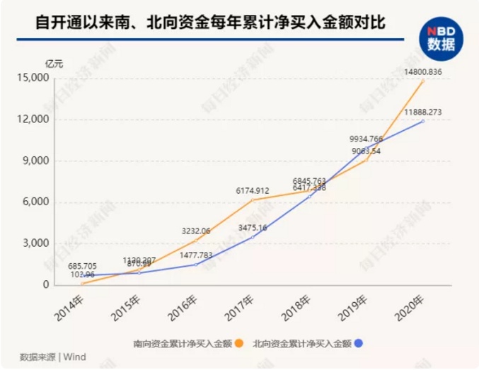 Wind数据显示,以开通以来累积计算,截至12月24日,南向资金累计净买入金额达到14800.836亿元,而北向资金累计净买入金额为11888.273亿元。