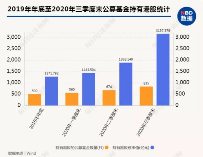 Wind数据显示,2019年年底共有500只公募基金持有港股,总市值合计达到了1271.7921亿元;2020年一季度末,共有560只公募基金持有港股,当期市值总共达到了1433.5037亿元;2020年二季度末,公募基金持有港股市值达到了1888.1487亿元,持有的基金数量达到了674只;2020年三季度末,更是共有835只公募基金购买了港股,持有的港股市值是达到了3157.5757亿元。